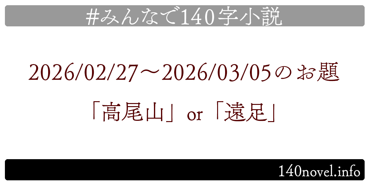 こちらのお題のまとめページには#みんなで140字小説での呟きを埋め込み表示しています。追加・削除等のご依頼は@min140nにご連絡ください。