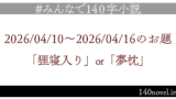 お題と小説こちらのお題のまとめページには#みんなで140字小説での呟きを埋め込み表示しています。追加・削除等のご依頼は@min140nにご連絡ください。